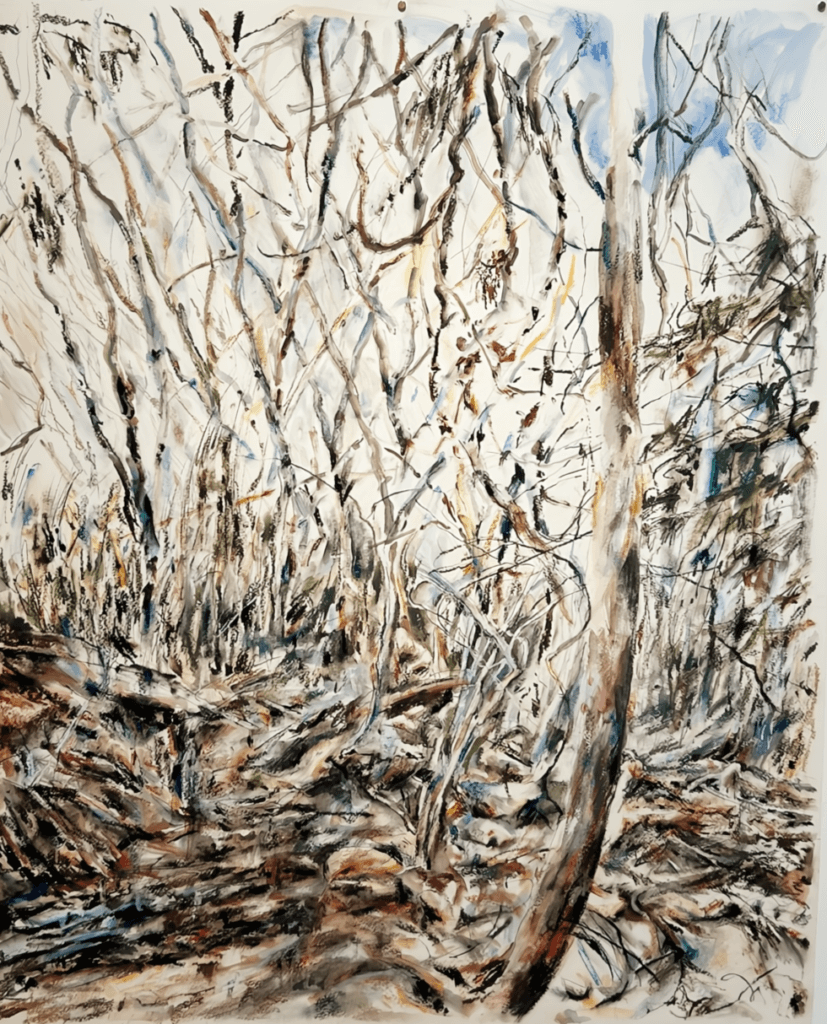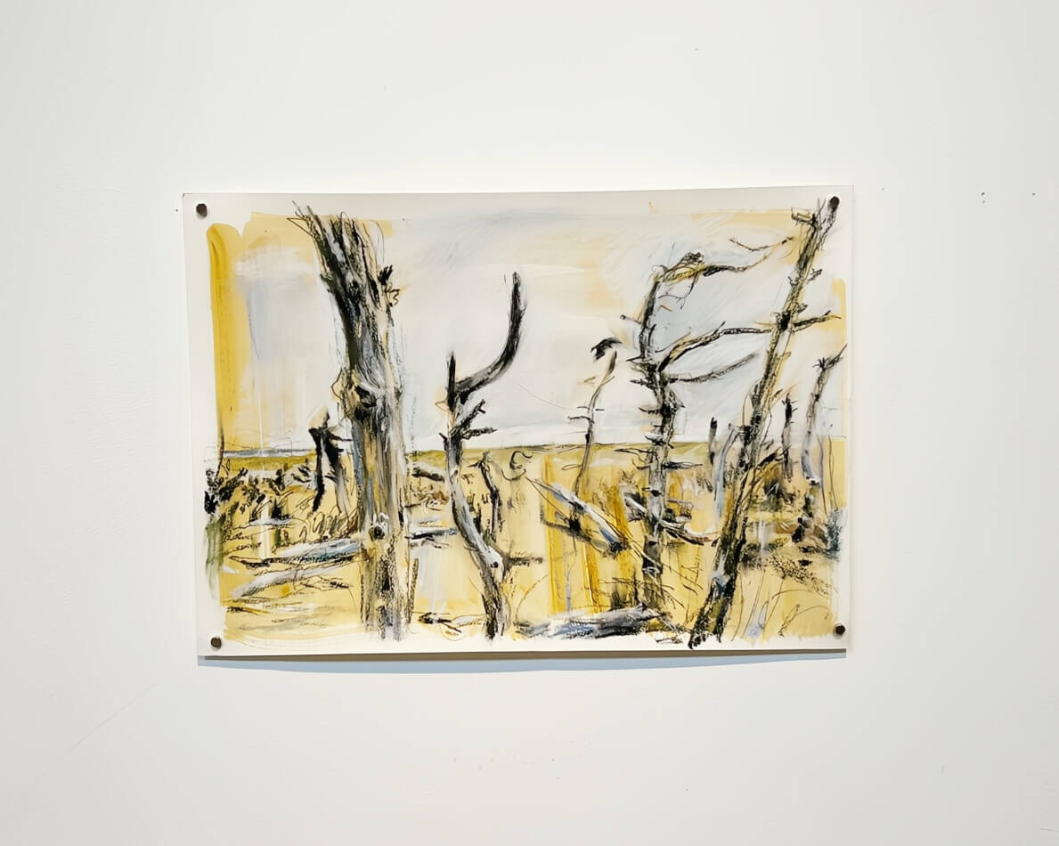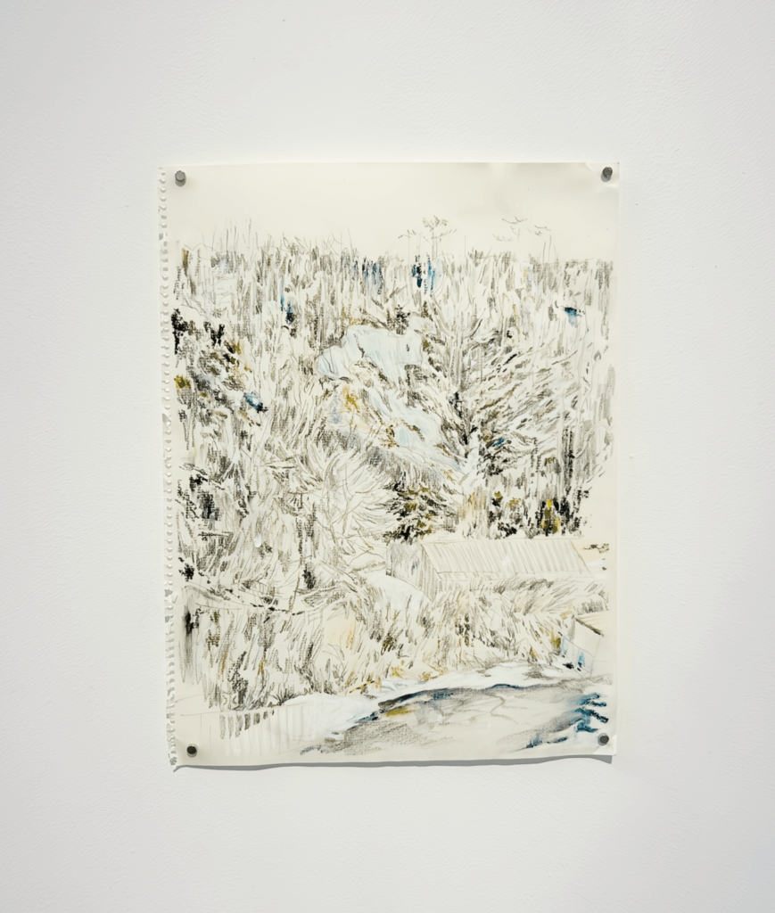 それは、果てしなく広がる荒涼とした風景だった。画面上部のぼんやりとした遠景に地平線が混ざりこみ、そこがかろうじて空のはじまりであることがわかる。前面に広がる地面は、枯れて倒れた雑草なのか、またその上に薄く雪が積もっているのか、少し濁った色の細かい線描で荒々しく埋め尽くされていた。2020年頃から本格的に絵を描きはじめた画家の菊池聡太朗は、こうした殺伐とした風景を繰り返し描き続けている。彼の絵は、家や道路、あるいは人影など人為との関わりから離れたところにある。それは、人の営みの外に放棄された、まさに「余りの風景」と呼ぶにふさわしい。