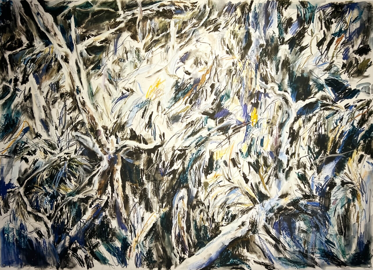 では、菊池の描く荒涼とした風景、あるいは絵の内容は、本質的に空虚で、絵の形式を埋めるだけのものなのか。いや、まったくそうではない。素早いタッチで荒々しく描かれたように見える菊池の線描は、画家の感覚を的確に形と色に置き換え、画面上に表わしていく。それはある種の造形的な軽やかさでもあり、観る者の感傷や思考を混沌とした風景の内部へと不必要に侵入させることを防ぐ役割をも果たす。オイルパステルを使ってところどころに現れる黄色や茶色の差し色は、意外なほど鮮やかで、時にはシュールレアリスト的な即興性を盛り込みながら、迷いの無い線の鋭さとともに、菊池の造形的な洗練を余すところなく伝える。そうした画家としての技量は、おそらく彼が独自の絵を追求していく渦中でもたらされたもので、彼の信念の痕跡でもあるだろう。